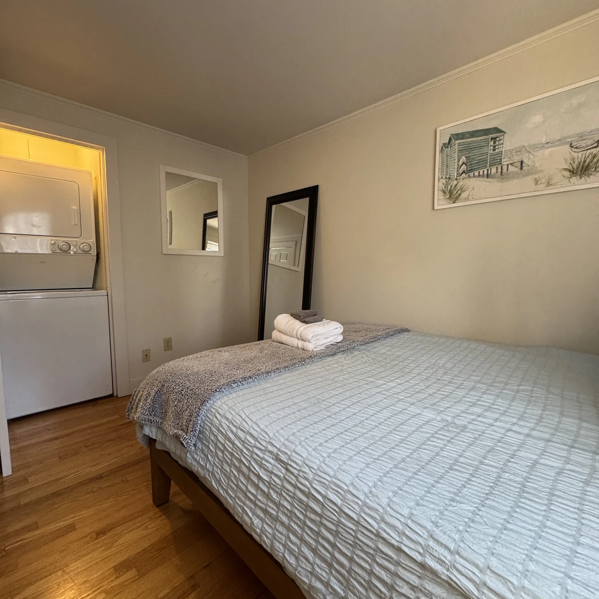 This cottage features 3 bedrooms, 2 bathrooms, and sleeps up to 7 guests. The open living room offers forest views through sliding doors. The master bedroom has a king bed and en suite bathroom. Kitchen equipped with essentials. Located an 8-minute walk from downtown and a 15-minute walk to the beach, it's ideal for family or friend getaways. Outdoor area includes a deck and space for 3 vehicles. Internet available. Beach essentials provided.